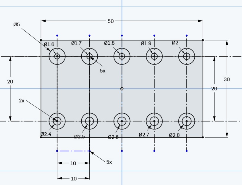 Ich habe mir aus China entsprechende Schrauben mit Innensechkant in den Größen 2×5, 2×8, 3×5, 3×8 und 3×10 schicken lassen. Nun wollte ich gerne wissen wie groß die Bohrungen für diese Schrauben sein müssen. Dazu habe ich ein kleines Testteil mir Onshape entworfen: